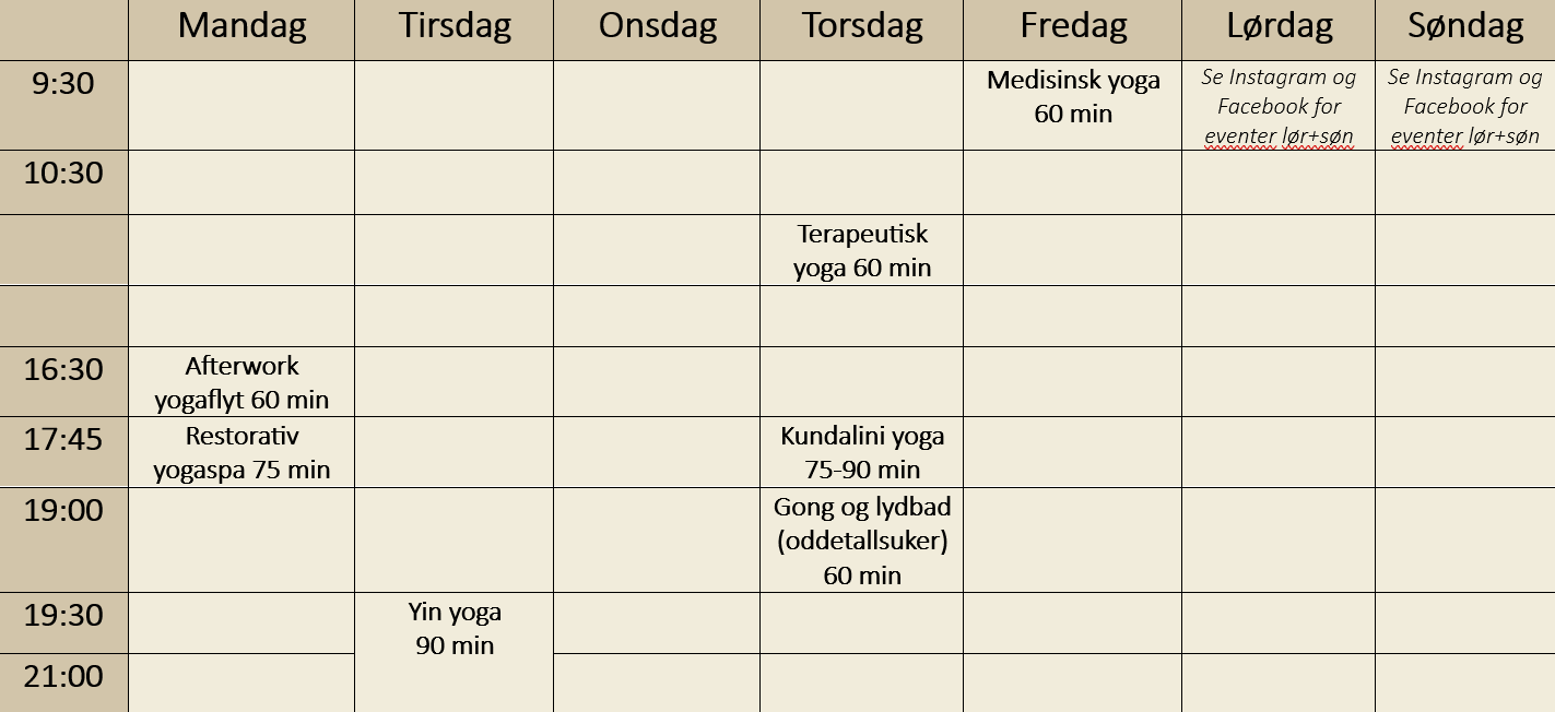 Dette er våre faste timer. Se instagramkonto for oppdatert uke som inkluderer spesielle arrangementer. Ved avbestilling av yogaklasse, send e-post til post@favnyoga.no eller på sms til 411 36 840 senest 5 timer før start. Yogaklasser som ikke avbestilles innen tiden refunderes ikke, eller gis tilbake bruk av klippekort.